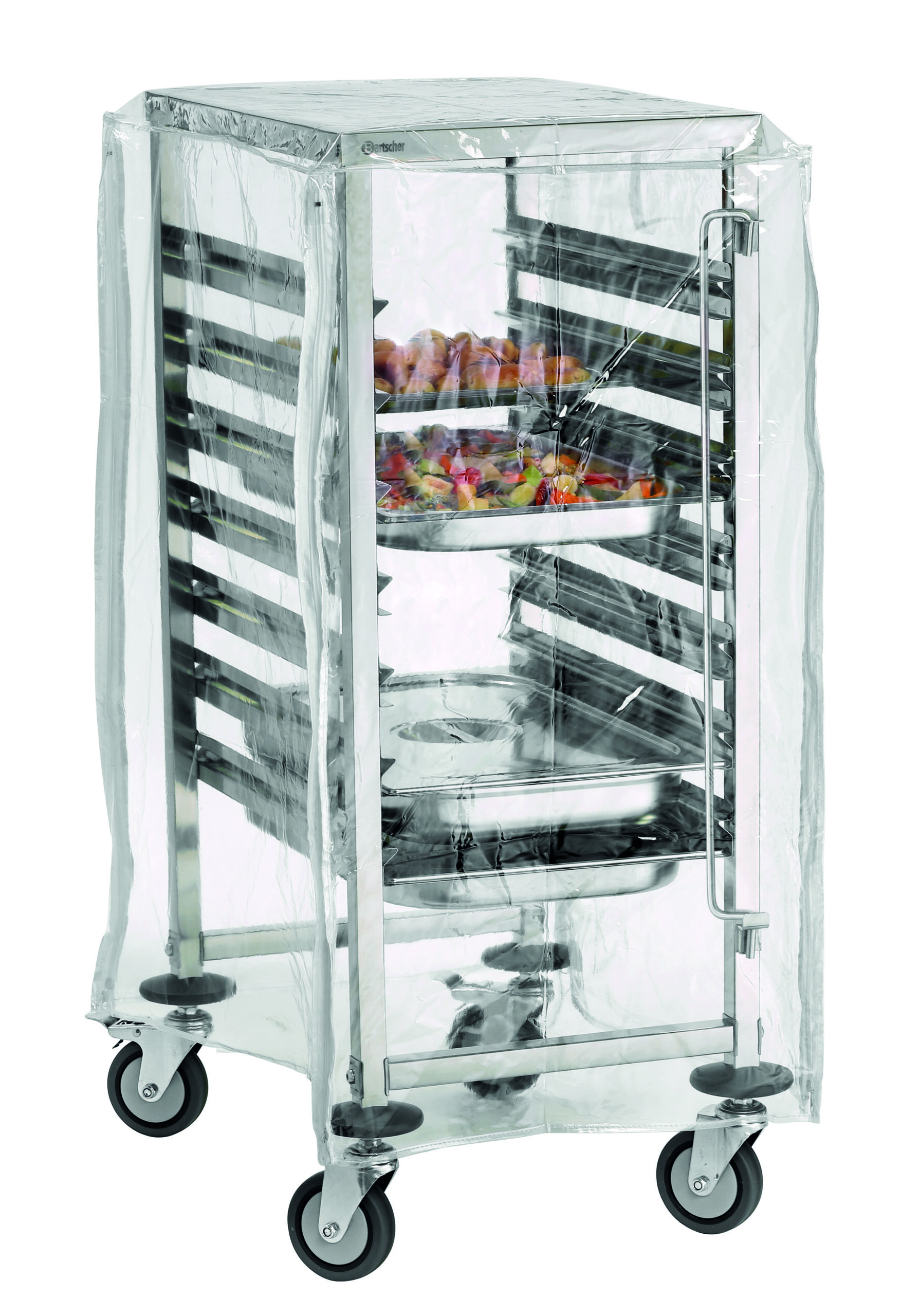 Die zum Gastronormwagen AGN700-1/1 passende transparente Abdeckhaube schützt bei Transport und Lagerung vor Staub und Unreinheiten – sogar in Kühlräumen. Die Reißverschlüsse ermöglichen ein unkompliziertes Bestücken des Wagens auch mit aufgezogener Haube.