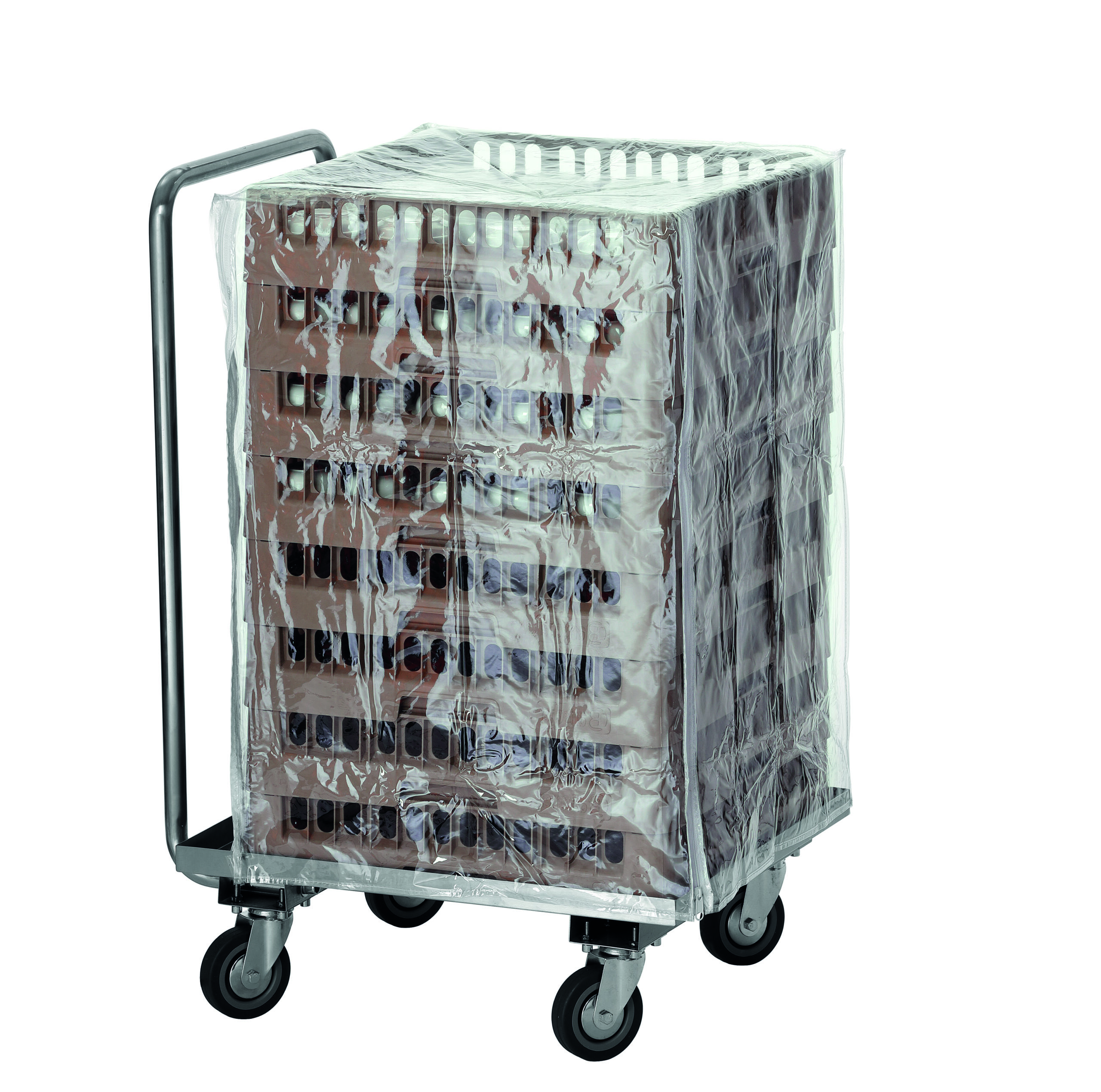 Die zum Geschirrkorbwagen TGS100 passende transparente Abdeckhaube schützt bei Transport und Lagerung vor Staub und Unreinheiten – sogar in Kühlräumen.