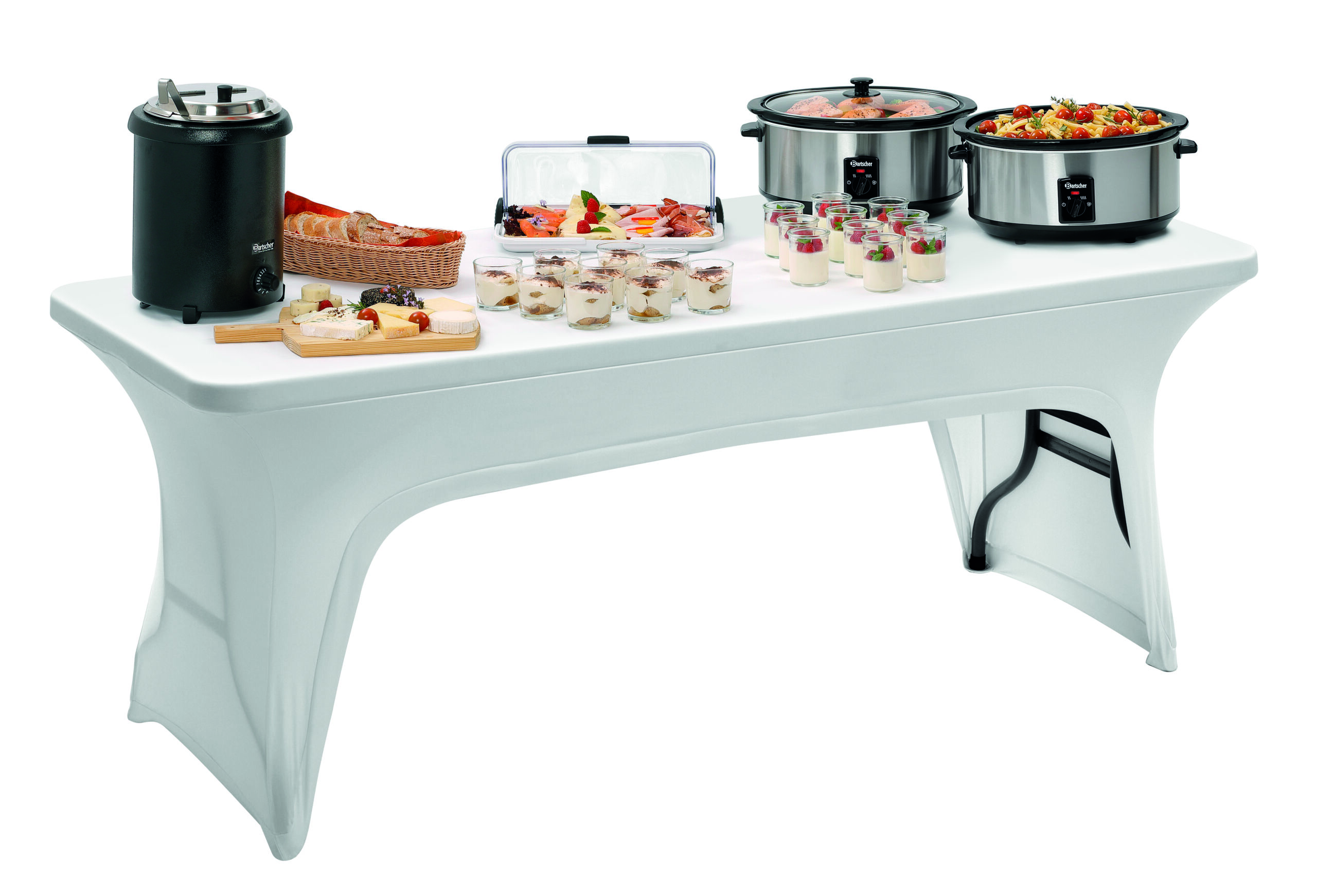 So wird jedes Buffet zum festlichen Hingucker – Die pflegeleichte Bankett-Husse sorgt für ein festliches Buffet bei jedem Event.