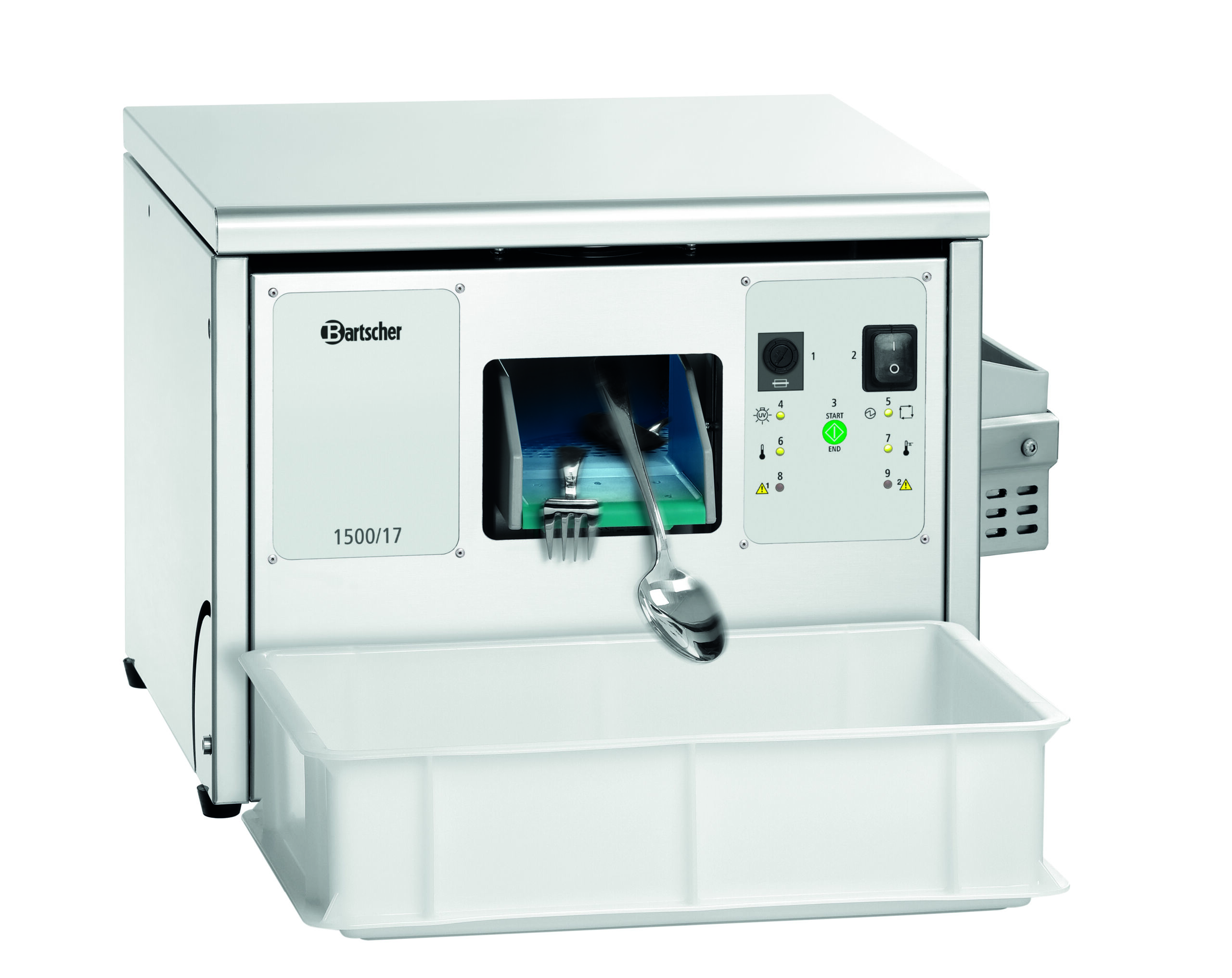 Besteck auf Hochglanz poliert – Bis zu 1.500 Besteckteile pro Stunde. Dank der integrierten UV-Lampe und der HACCP-konformen Betriebstemperatur sind die Besteckteile hygienisch frisch desinfiziert.