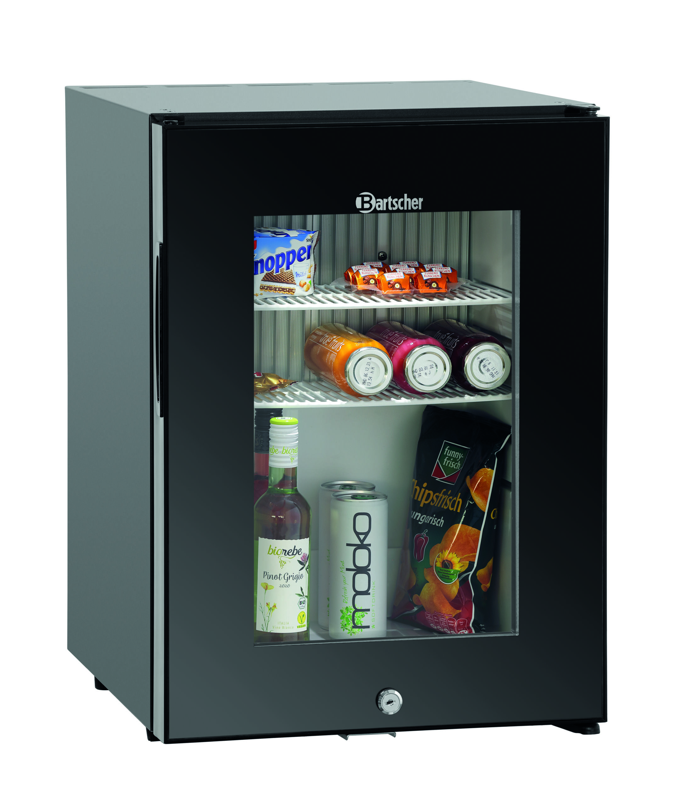 Einbaufähige Minibar mit Beleuchtung und stufenloser Temperaturregelung. Die Glastür ermöglicht einen schnellen Überblick über die angebotenen Erfrischungen und Snacks.