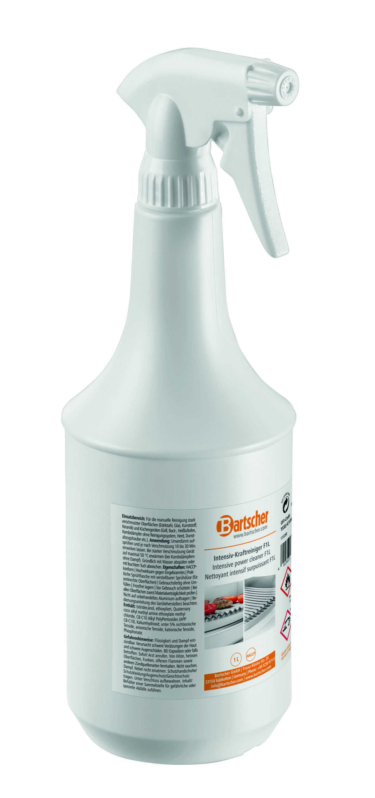 Intensiv-Kraftreiniger für die Reinigung stark bis extrem verschmutzter Küchengeräte und Oberflächen. Anwendungssichere manuelle Reinigung dank Sprühflasche – Optimal für die Reinigung von Grill, Backofen und Kombidämpfer ohne Reinigungssystem sowie auch Fritteusen.