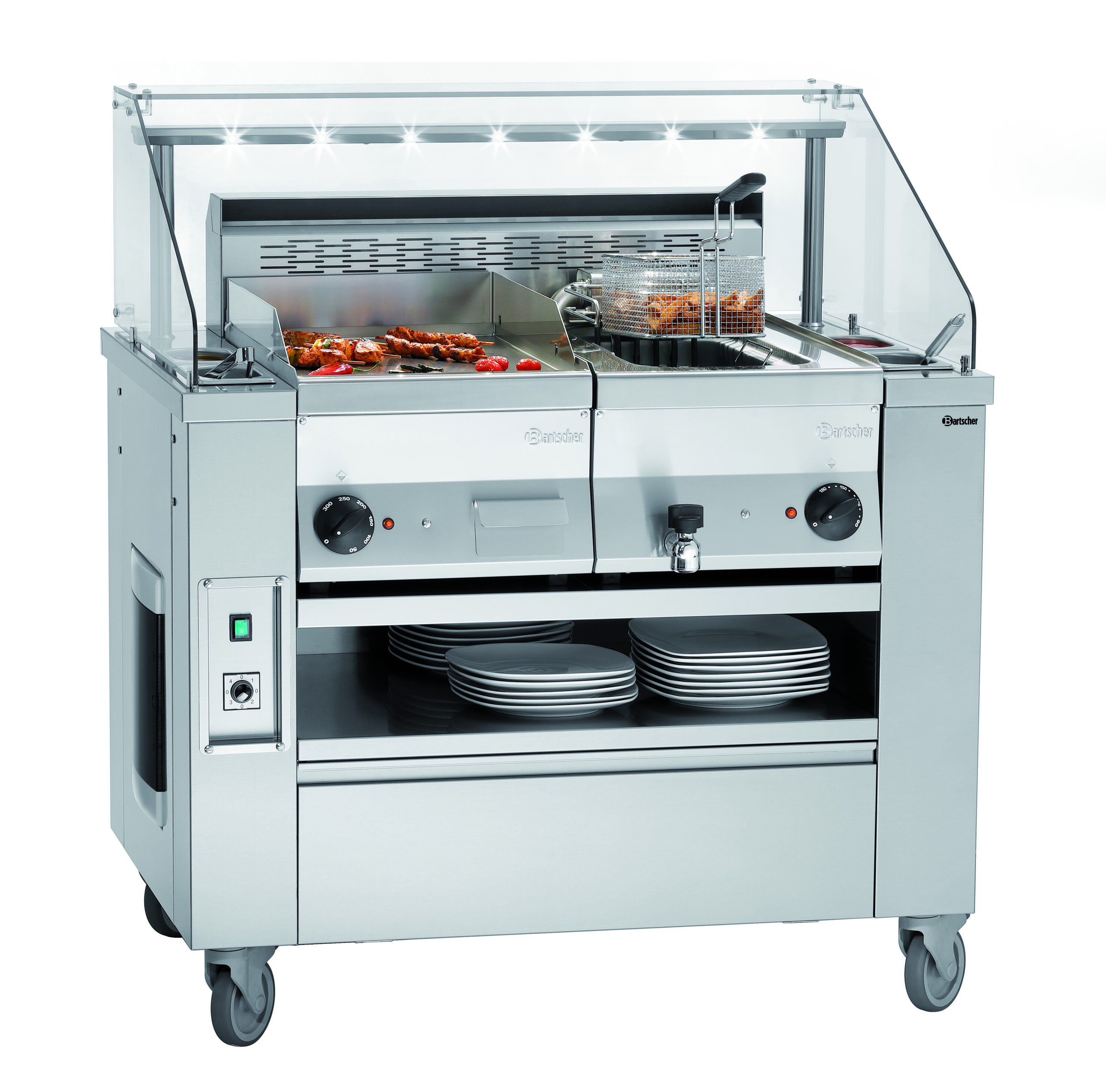 Mobile Kochstation für einen professionellen Auftritt im Front-Cooking-Bereich. Vom Induktionskocher mit 230 V bis hin zur soliden Griddleplatte der Serie 650 mit 400 V – Mit bis zu 2 Auftischgeräten extrem flexibel im Catering-, Event- und Front-Cooking-Bereich einsetzbar.