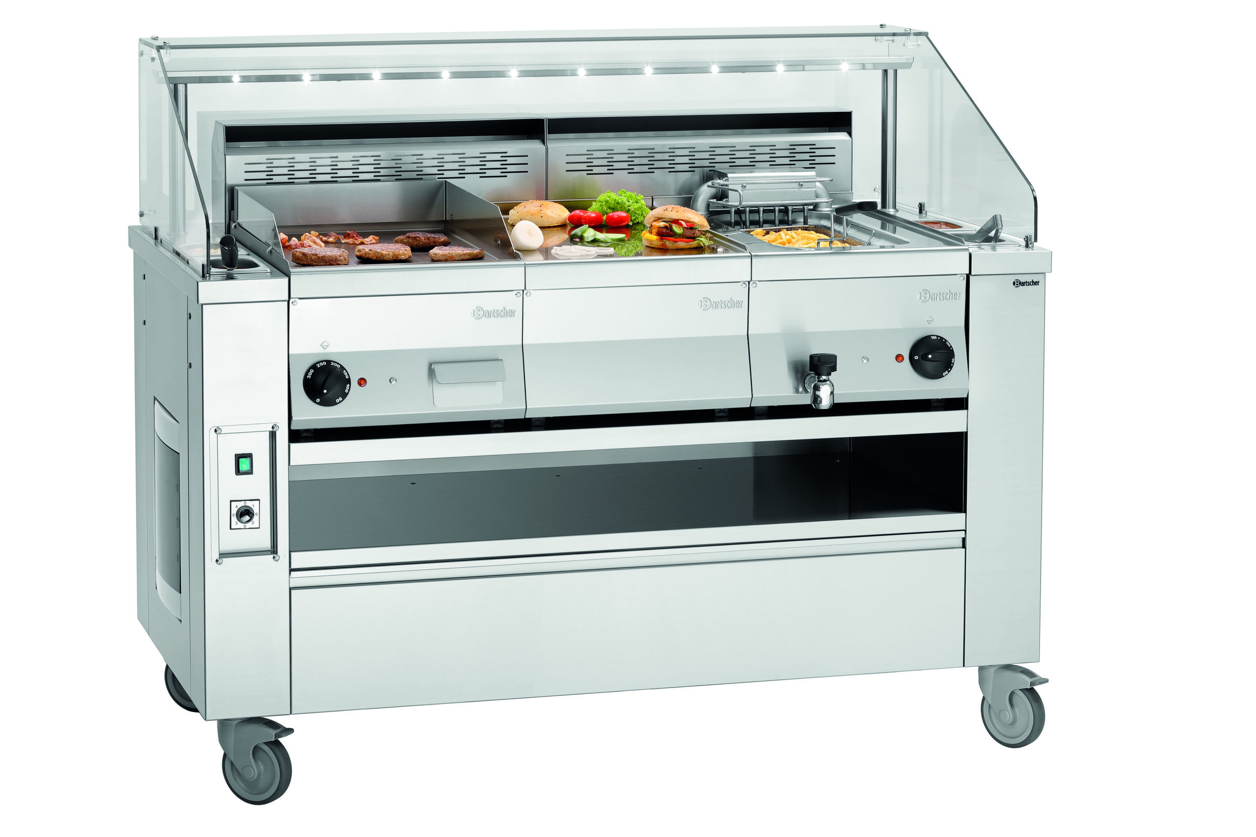 Optimierte mobile Kochstation für einen professionellen Auftritt im Front-Cooking-Bereich. Vom Induktionskocher mit 230 V bis hin zur soliden Griddleplatte der Serie 650 mit 400 V – Mit bis zu 3 Auftischgeräten extrem flexibel im Catering-, Event- und Front-Cooking-Bereich.